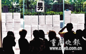 114號男士的資料顯示:28歲,身高1.78米,重大建筑系碩士畢業(yè),目前在江北區(qū)一事業(yè)單位做設(shè)計工作。母親張女士身旁坐了8位父母,排隊和她交談。“我女兒在重慶師范大學讀研究生,單位委培,長得也秀氣。”“我女兒也不錯,西南財大畢業(yè),在建行上班”……幾位媽媽相互比拼,張女士連忙拿出筆記本一一記下他們的電話,說:“條件都好,我們當父母的只是搭橋,讓兒女們自己選吧。”