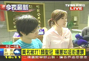報道稱,一名年約30歲的女子突然拉扯顏圣冠的馬尾,楊蕙如上前制止時,遭到抓傷,2人隨即到仁愛醫院驗傷,幸好只是輕傷,不過都受到驚嚇,到警察局制作筆錄。