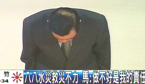 馬英九今日下午率領包括蕭萬長、“行政院副院長”邱正雄等人,向媒體強調救災決心,馬英九也率領全體與會官員向民眾180度鞠躬致歉,長達十秒鐘之久。