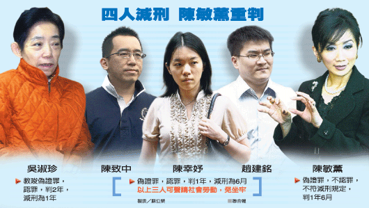 中新網9月2日電 據臺灣《聯合報》報道,臺北地方法院審理陳水扁家族弊案,陳水扁女兒陳幸妤、女婿趙建銘和兒子陳致中坦承作偽證,合議庭認為陳水扁的證詞和子女的偽證內容相同,扁是否涉及教唆偽證,檢方應另行偵辦。