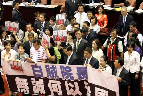 民進(jìn)黨團(tuán)的阻撓行為導(dǎo)致議事延誤逾一小時(shí)。近中午時(shí),雖然吳敦義順利上臺(tái),但在藍(lán)綠“立委”的雙重人墻包圍下,僅報(bào)告約10分鐘即結(jié)束。在隨后的總質(zhì)詢中,吳敦義接任“行政院長(zhǎng)”前的香港之行,成為民進(jìn)黨“立委”質(zhì)疑焦點(diǎn)。