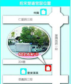 房仲業者說,這間房地每坪底價222萬余元,多家業者都出價搶標,最后被邱寶慧以每坪602萬元、總價7.3億元標走,創島內住宅區土地標售史上次高紀錄。