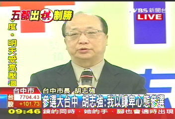 中新網(wǎng)5月13日 據(jù)臺(tái)灣TVBS電視臺(tái)報(bào)道,國(guó)民黨中常會(huì)昨天通過(guò)“五都”市長(zhǎng)提名征召人選,藍(lán)營(yíng)年底選戰(zhàn)五虎將正式就戰(zhàn)斗位置。爭(zhēng)取大臺(tái)中市長(zhǎng)的胡志強(qiáng),今日上午召開(kāi)記者會(huì),正式對(duì)大臺(tái)中市民表態(tài)參選。他表示將以最謙卑的心情,來(lái)參選大臺(tái)中市長(zhǎng)。