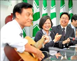 中新網6月3日電 據臺灣《自由時報》報道,民進黨二日成立“五都”選戰小組,由前秘書長吳乃仁擔任召集人,為年底“五都選舉”擬定策略。黨主席蔡英文在歡送秘書長蘇嘉全參選大臺中市長記者會上,兩人“答嘴鼓”。蘇嘉全還拿著吉他對著蔡英文唱情歌,蔡英文尷尬地笑了出來。