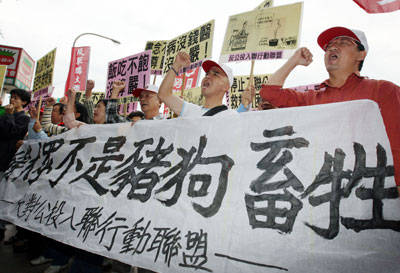 抗議者還利用豬頭道具,反諷民進黨參選人謝長廷日前有關“人不能只重視吃飯問題,否則就像只會吃和睡的豬狗等畜牲”的言論,質疑謝長廷,“難道不食人間煙火?”