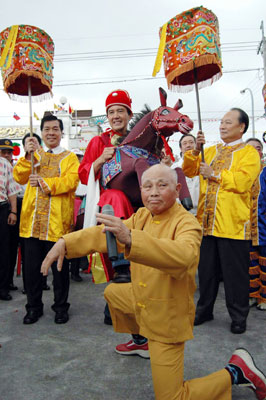 中新網(wǎng)10月29日電 國(guó)民黨參選人馬英九今天走訪臺(tái)灣歌仔戲發(fā)源地宜蘭縣員山鄉(xiāng)時(shí),除了詳細(xì)聽取當(dāng)?shù)厝耸拷庹f典故之外,還穿上戲服表演了一段“狀元游街”。