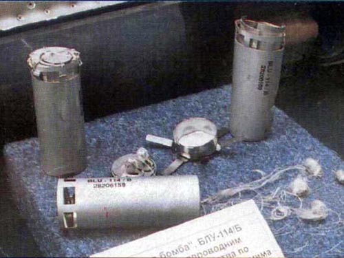 據(jù)美國科學(xué)家網(wǎng)站資料指出,美軍石墨炸彈在空軍編號為BLU─114/B,是透過在易拉罐大小的罐內(nèi)裝進大量石墨絲,然后將這些石墨罐再裝進較大的集束彈體中,以子母彈的方式進行投射,石墨彈在散開后,尾部還會掛載降落傘,以利于讓罐內(nèi)石墨絲大面積散開,并平均落在發(fā)電廠或高壓電纜上,讓電纜瞬間燒毀。