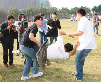 廖姓學(xué)生與安全人員拉扯,躺在地上大喊“樂生依法定古跡”,被抬離現(xiàn)場(chǎng)。同行一名瘦小的王姓女學(xué)生走近想幫忙,卻被安全人員來一記過肩摔,雖無明顯外傷,已受到驚嚇。不少學(xué)生氣憤地說:“嗆得好,我們都快活不下去了。”