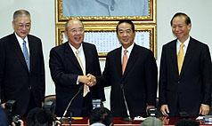 國民黨主席吳伯雄(左二)親民黨主席宋楚瑜(右二)14日在國民黨中央黨部舉行記者會,共同宣布“立委”選舉國民黨禮讓親民黨的不分區名單。 來源:“中央社”