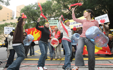 圖文:臺(tái)"火大聯(lián)盟"敲著水桶跳舞諷刺當(dāng)局無(wú)能