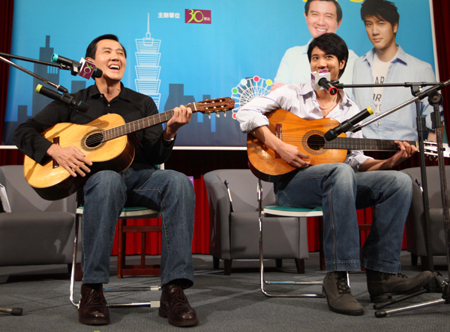 據“中央社”報道,馬英九穿著牛仔褲和Polo衫和王力宏合唱英文歌曲《I Understand》。馬英九說,這是他高三時花了一百七十多元買的吉他,練的第一首歌曲。王力宏則從未聽過此曲,他笑著說,先前還熱心找了一些“老歌”,沒想到在馬英九眼里全是“新歌”。