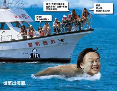 王世堅在“立委”選舉前曾經揚言,如果國民黨在臺北市能“八仙過海”(意指國民黨在臺北市的八位候選人都當選)就要跳海。結果不幸言中,遂成為網友揶揄、炮轟的箭靶。不得不硬著頭皮履行承諾的王世堅此前曾表示,自己泳技不錯。據悉,他擔任臺北市議員時期,還曾經掛名中山區(qū)體育會游泳委員會主委。