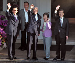 馬英九與蕭萬長27日展開請益之旅,首站拜會李登輝,李登輝與夫人親自到門口迎接,四人并向守候的媒體揮手。(中國時報圖)