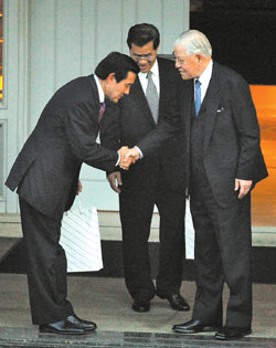 馬英九與蕭萬長27日展開請益之旅,首站拜會李登輝,雙方在會談一個多小時后馬蕭兩人向李登輝握手道別。(中國時報圖)