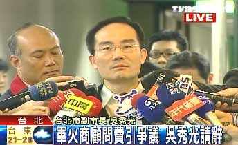 中新網(wǎng)4月24日電 據(jù)臺(tái)灣TVBS報(bào)道,被雜志報(bào)道疑似收受軍火商顧問費(fèi)引發(fā)爭(zhēng)論的臺(tái)北市副市長吳秀光,23日大動(dòng)作控告媒體以及民進(jìn)黨民意代表后,原本說不再發(fā)言的他,下午4點(diǎn)再度召開記者會(huì)。