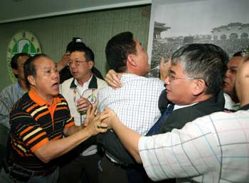 昨晚在臺北市舉辦挺扁大會的臺北市黨部主委黃慶林今天率眾到黨中央抗議,要求王拓下臺。中央黨部副秘書長洪耀福接見時開口提及“當初第一個主張開除陳水扁的就是黃慶林”時,黃慶林立刻拍桌表示不滿,立即引發拉扯沖突,場面混亂,黃慶林人馬與中央黨部人員發生扭打,最后洪耀福在黨工的保護下先行離開。