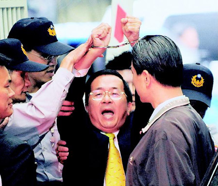 進入特偵組7個小時后,特偵組以海外洗錢案、“機要費”貪腐案涉嫌貪污、收賄等四項罪名,正式向臺北地方法院聲請收押陳水扁。下午4時20分,陳水扁步出特偵組,來了一個“最后政治秀”。他墊起腳尖,高舉銬著手銬的雙手長達17秒,高喊“政治迫害”“司法冤獄”“臺灣加油”等口號,“從容就義”登上警車。