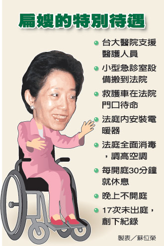 除了基本的醫(yī)療戒護(hù),臺(tái)北地院擔(dān)心長(zhǎng)時(shí)間開庭,虛弱的吳淑珍會(huì)撐不住,每開庭30分鐘就休庭10分鐘,庭訊預(yù)計(jì)3小時(shí),而且晚上不開庭,甚至在律師進(jìn)行答辯時(shí),吳淑珍還可以到一旁的第八法庭稍作休息。這樣的高規(guī)格對(duì)吳淑珍,就是要讓審理過程更加順利。