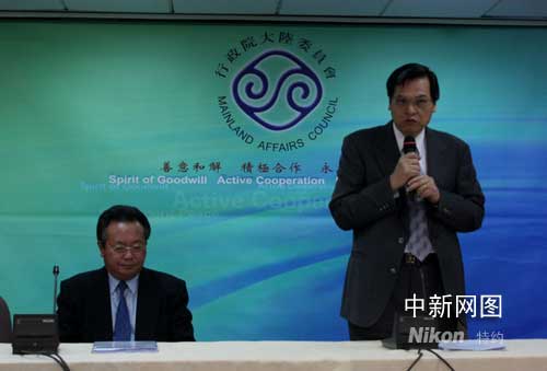 五月十三日下午,;鶗(huì)旅行服務(wù)處處長(zhǎng)劉克鑫(左一)在“陸委會(huì)”舉行的記者會(huì)上通報(bào)臺(tái)胞在四川地震災(zāi)區(qū)情況。作 者:陳立宇