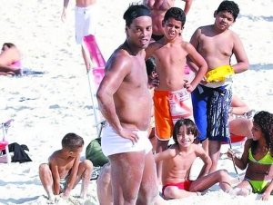 因為此前AC米蘭一直對他能否留隊舉棋不定,世界杯又被鄧加拋棄,小羅只好自己去尋開心,他先是相約帕托等人在奢華酒店享受,隨后又到里約熱內盧沙灘玩耍。只是他忘了給自己的大肚腩遮羞,臃腫的身材似乎正在向大羅看齊。