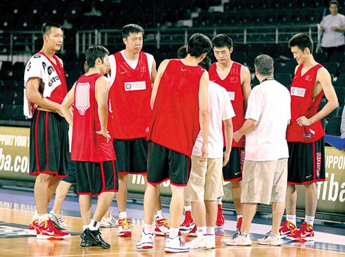 海外拉練已經(jīng)大半個月,但男籃小伙子看起來沒一點疲憊。在一個半小時的訓練中,真打真槍,個個拼命。分組對抗中,大鵬被張兆旭狠狠地打掌打在手腕上、周鵬的眼睛被戳傷、丁錦輝快攻差點滑倒……穿著紅球衣的是主力陣容:易建聯(lián)、王治郅、劉煒、孫悅和王仕鵬,場下還站著周鵬和丁錦輝,這7人看來就是世錦賽中國隊的主力及輪換陣容了。