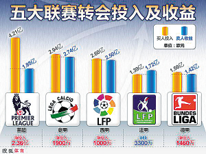 由于對于轉會費看法不一,各國媒體對于總體轉會費的統計存在差距,但目前比較可信的數據顯示,今夏轉會市場上,英超以4.21億歐元的投入雄踞榜首!睹咳针娪崍蟆吩诉@個數據,但資料同時顯示,英超轉會收入只有1.85億歐元。也就是說,英超凈投入達到2.36億歐元。但真正令人震驚的數據還在后面,英超大約2.6億英鎊的轉會費流到了歐洲大陸俱樂部的賬戶之中,本國聯賽之間的人才轉會費用不足一半,這個數字比去年同期增長了66%。