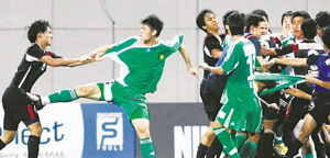 到了下半場,雙方的動作越來越粗野。第88分鐘,場上比分為1比1時,北京國安隊的5名球員突然包圍幼獅隊的一名球員。接著,兩隊的替補球員紛紛沖進(jìn)球場,彼此拳打腳踢打成一團。