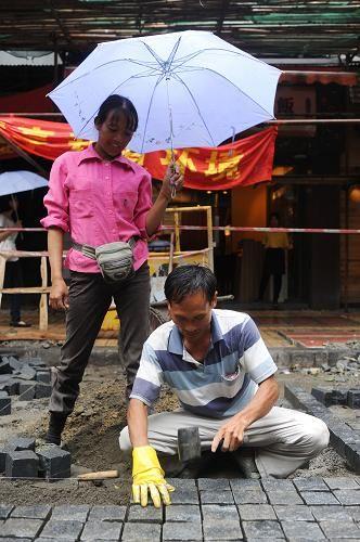來(lái)自廣西的黃秀樹(左)為正在鋪路的丈夫廖孫國(guó)一邊撐傘一邊遞磚