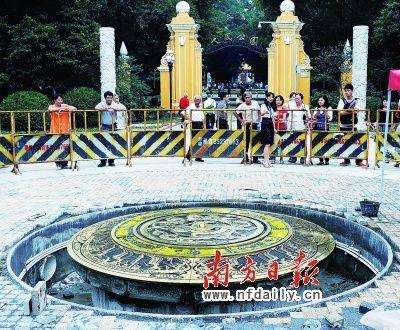 據(jù)介紹,原點標志表面微凸,高出地面15厘米,直徑3米。標志物外圍采用灰、黑兩色花崗巖作襯邊,沿放射線方向鑲嵌銅條,花崗巖表面陰刻了廣州建城歷史簡記。內側圓盤采用2厘米厚的黃銅板和巴西水晶石制成,重達3噸,圖案取材于南越王墓出土的“龍鳳玉佩”和“羽人駕舟”浮雕圖案,彰顯了嶺南文化特色。