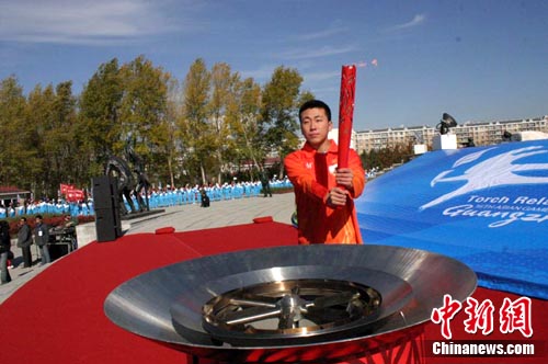 中新社長春10月15日電 (李彥國 田偉)第16屆廣州亞運會火炬15日在吉林省長春市進行展示性傳遞,這是本屆亞運會火炬傳遞在廣東省外的第二站。16名火炬手在長春世界雕塑公園完成16棒傳遞,5000余名長春市民現場見證這一時刻。