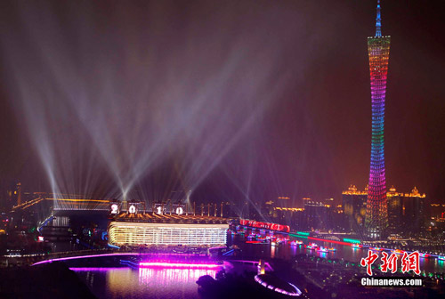 11月10日晚,廣州亞運會開幕式舉行最后一次彩排,珠江兩岸流光溢彩。中新社記者 任晨鳴 攝