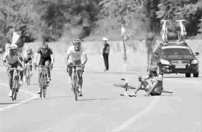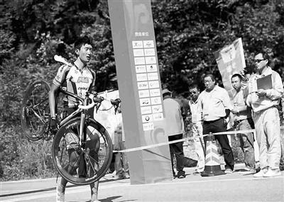 昨天在本溪進行的第十二屆全運會自行車男子公路個人賽中,解放軍隊選手吳佩倫在臨近終點沖刺時不慎摔倒(見上圖),但是他并未因此放棄比賽,而是扛著自行車走過終點線(見上圖),最終以4小時42分14秒的成績位列第26名。吳佩倫的行為,生動體現了永不言棄的體育精神,賽后他說:“我到這里,不是來聽發令槍的,而是要沖過終點線的。”