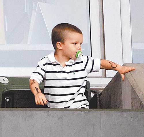 中新網6月10日電 據臺灣媒體報道,足壇“萬人迷”貝克漢姆(David Beckham)是紋身狂,身上至少有12處刺青。“有其父必有其子”,小貝愛子克魯茲雖然只有3歲,也在手臂上貼滿了刺青貼紙。英國的《太陽報》形容他是“迷你版貝克漢姆”,但小貝恐怕不能學愛子含奶嘴的可愛樣子。