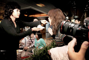 黑色的時尚小衫,修身的牛仔褲,一身休閑打扮的韓端星味十足。晚上9點(diǎn)的航班,韓端提前三小時就開始辦理登機(jī)手續(xù)。原以為自己來得夠早了,沒想到因?yàn)閬砹瞬簧佟棒兆印保瑫r間還是不夠用。