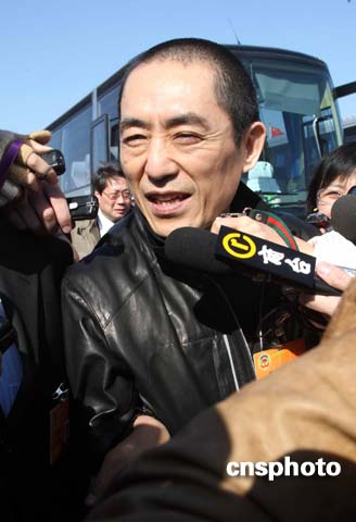 前來出席十一屆全國政協一次會議的張藝謀甫一下車,就被眼尖的記者發現,他的身邊迅速形成了一個巨大的包圍圈。面對記者圍堵,張藝謀起初一言不發,后見“形勢不妙”,便停下腳步。