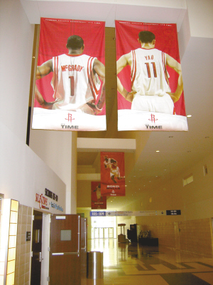 【鏡頭一】從豐田中心正門進去,首先進入眼簾的,是掛在空中的兩個巨大背影——姚明和麥迪,遠處是威爾斯和阿爾斯通。(下左圖)