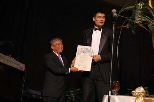 在晚宴中間,休斯頓市長比爾-懷特的代表、前市議員關振鵬講話宣布,比爾-懷特市長頒發特別文告,命名4月17日為姚明日(Yao Ming’s Day)。