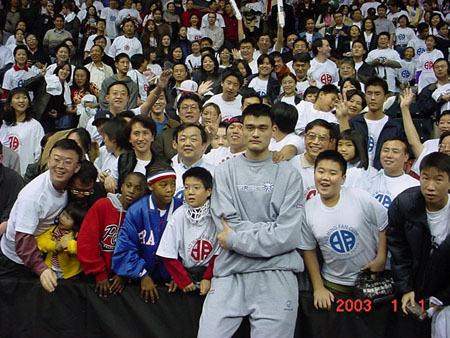 講話之后,姚明首先來到113區,詢問站在第一排的球迷俱樂部幾位資深理事,我是站著還是坐著與你們照相?一直在張羅這項活動的姚明球迷俱樂部常務副會長喬鳳祥教授和前會長謝忠齊聲回答:“姚明,你就坐下與我們合影吧”!姚明在三位火箭隊工作人員的陪伴下立即坐在第一排,再次與千百位華人球迷留下了一張新的大合影。幾分鐘后,姚明又到114區,與等候在那里的數百名華人球迷也合影留念。(勞荊)