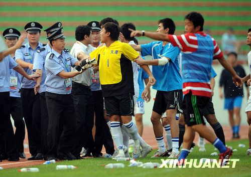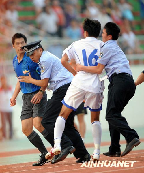 全運會比賽超越競技層面。昨日,全運會男足甲組小組賽第三輪比賽結束,北京隊3比1戰(zhàn)勝天津隊獲得小組第一。輸掉比賽的天津隊不但在比賽中被罰下三名球員,賽后幾乎所有隊員都參與了追打主裁判的“工作”,替補隊員12號趙世桐狂追了當值主裁判何志彪近100米并將其摁倒,使其臉部著地后狂打數拳,由此掀開了一場激戰(zhàn)。
