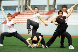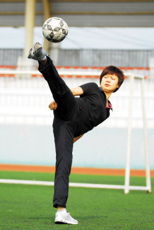 董靜拿了個(gè)足球在場(chǎng)上顛,基本上只能顛三四個(gè)。立在體育館門前的武術(shù)班教練簡(jiǎn)介上寫著,董靜曾獲得過河北散打錦標(biāo)賽65公斤級(jí)冠軍,但讓她參加散打比賽行,讓她控制好這個(gè)小小的皮球,卻不容易。美女功夫足球隊(duì)名聲在外,真要踢起比賽來,不堪一擊。她們和當(dāng)?shù)貓F(tuán)委及一家外企的男隊(duì)進(jìn)行過兩場(chǎng)較量,結(jié)果慘不忍睹。