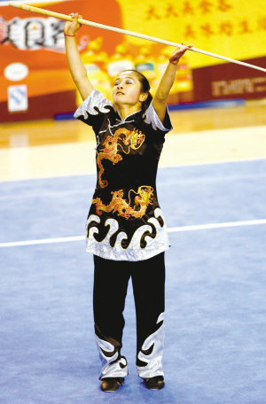昨天上午,在濱州奧體公園體育館舉行的女子棍術比賽,代表重慶參賽的17歲小將袁夢潔一出場就吸引了觀眾的目光,“這套服裝不錯,挺好看的!”袁夢潔穿的一件鑲有亮片的金色服裝,中間腰帶緊收,下裝則是黑褲但在腳邊又有金色的花型,在整個體育場燈光的照耀下,特別搶眼。