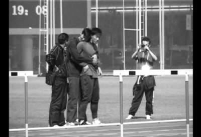 跨完一組欄后,劉翔站在跑道邊,叉著腰休息。這時,一名站在一旁、身穿黑色T恤、身背帶有參賽號碼布背包的男運動員突然走到劉翔身后,從身后將劉翔雙手抱住。隨后的舉動更加雷人,該男子居然做出一副小鳥依人的模樣,還將頭靠在劉翔的肩頭。一邊陶醉地抱著,該男子還一邊在劉翔耳邊耳語了兩句。
