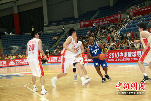 5月7日,周五的晚上,2010年中美明星籃球賽在浙江杭州黃龍體育館開賽。和姚明搭檔過的卡爾-蘭德里,拿過NBA總冠軍的“手套”佩頓,代表美國國家隊拿過奧運會金牌的里奇蒙德……賽前,主辦方的宣傳詞句中,不乏璀璨的光環。