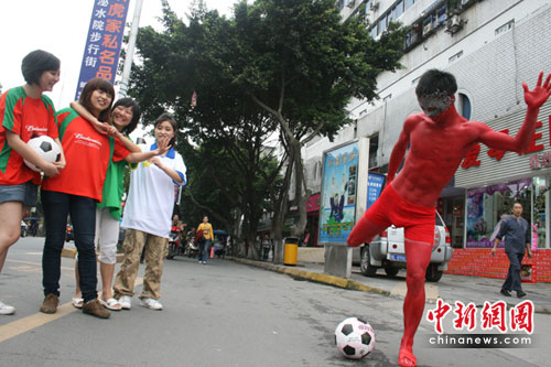 18時許,一位頭戴面具,滿身紅色的“怪人”突然現(xiàn)身樂山城區(qū)街頭,身邊還有幾位足球?qū)氊惛S,這一幕引來了不少行人駐足觀看。“媽媽,快看,那人全身都是紅的,好奇怪哦!”一位母親帶著孩子路過,一個“怪人”的出現(xiàn),讓孩子發(fā)出尖叫聲。只見“怪人”滿身涂滿紅色顏料,頭戴面具,手里還抱著一個足球。“怪人”停下后,拿著足球擺起各種踢球的姿勢,不少路人見此情景,立即停下腳步,紛紛圍觀,甚至還有人掏出手機拍照。