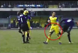 在本輪結束的國米與切沃的比賽中,盧西奧使出了一招“蝎子擺尾”,但是目標卻是對手的襠部。