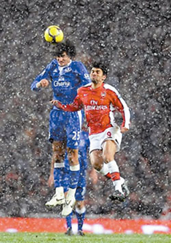 “槍手”與“太妃糖”一役在漫天大雪中開戰(zhàn),多人輪換的“槍手”上半場(chǎng)的表現(xiàn)乏善可陳。第12分鐘,做客的埃弗頓隊(duì)由奧斯曼頭槌首開紀(jì)錄。第27分鐘,德尼爾森幫助“槍手”將比分扳平。易邊再戰(zhàn)后,盡管雪勢(shì)更加兇猛,主客兩隊(duì)的表現(xiàn)反而愈發(fā)頑強(qiáng)。第81分鐘,埃弗頓隊(duì)在防守反擊中由皮納爾單刀赴會(huì)破門,客隊(duì)再度領(lǐng)先。補(bǔ)時(shí)第92分鐘,沒有放棄的“槍手”由替補(bǔ)出戰(zhàn)的羅西基驚險(xiǎn)地扳平比分。終場(chǎng)哨響,兩隊(duì)以2比2平分秋色。