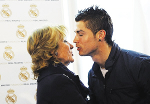 北京時間昨天是C羅的生日,他和皇馬主席弗洛倫蒂諾一起在伯納烏參加了一項新聞發布會;蜀R俱樂部與馬德里大區達成了合作協議,皇馬基金會將會投資幫助馬德里大區那些未成年人、外國移民等等。在新聞發布會現場,C羅和弗洛倫蒂諾開起了玩笑;蜀R主席問C羅“你現在多大了”,C羅回答“我20歲了”。弗洛倫蒂諾當即揭穿了C羅的謊言:“你已經25歲了,你竟然已經這么老了!”當然,這次玩笑以全場歡笑告終。 作為皇馬代表,C羅還與馬德里大區女主席阿吉雷進行了親密接觸。盡管阿吉雷的年齡足以當C羅的奶奶,但葡萄牙人還是跟她來了一個貼面熱吻。在被C羅熱吻之后,阿吉雷顯得非常高興,立刻說:“C羅是世界上最出色的球員,沒有之一!蓖瑫r阿吉雷也宣稱,“皇馬是歷史上最出色的足球俱樂部!