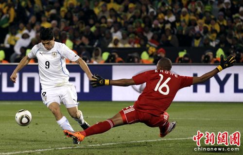 雙方易地再戰,第59分鐘南非隊門前再出險情,蘇亞雷斯晃開莫科納下底傳中,卡瓦尼捅射偏出,頗具威脅。第52分鐘,蘇亞雷斯帶球突入禁區被南非球員拉倒,不過主裁判并沒有任何表示。東道主逃過一劫。2分鐘后,烏拉圭再獲任意球機會,盧加諾在無人防守的情況下頭球攻門頂偏。
