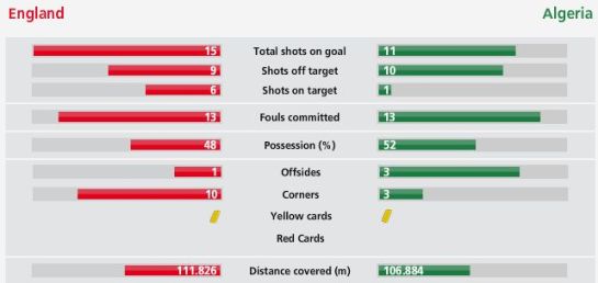 雖然英格蘭隊有魯尼、杰拉德、蘭帕德、特里等眾多大牌球星,但是他們的控球時間竟然不如對手,比對手低了4%。在越位方面,阿爾及利亞以3次領先于英格蘭隊,可見其進攻之心略為強烈。此外,英格蘭隊全場有10次角球,但都沒有轉化成進球。