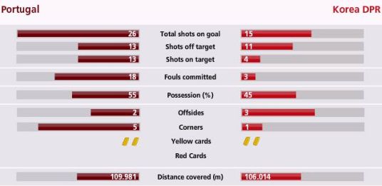 控球方面,葡萄牙隊占全場的55%,高于朝鮮隊的45%。角球方面也是葡萄牙占優,以5:1領先對手。在個人的速度方面,朝鮮隊也有多名球員高于葡萄牙隊球員,但是卻未能很好的把握,沒攻破對方的球門,讓人扼腕。